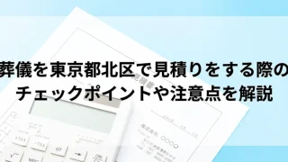 葬儀葬儀を東京都北区で見積りをする際のチェックポイントや注意点を解説 東京都北区で葬儀の見積りを取りたい方へ。費用を抑えながらも後悔しない葬儀社を選ぶための比較ポイントを解説。相場の目安や見積りで確認すべき項目を具体的に紹介し、納得の準備をサポートします。2025.11.05葬儀