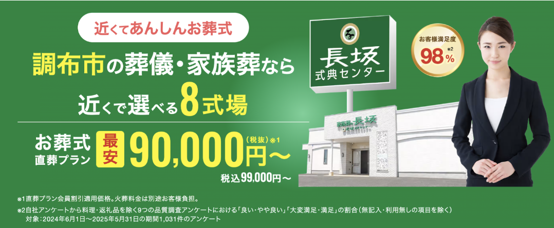 家族葬の長坂式典センターは、東京・埼玉で複数の式場を展開する総合葬祭社で、調布市周辺でも直葬・火葬式・一日葬・家族葬・一般葬など幅広い葬儀形式に対応しています。