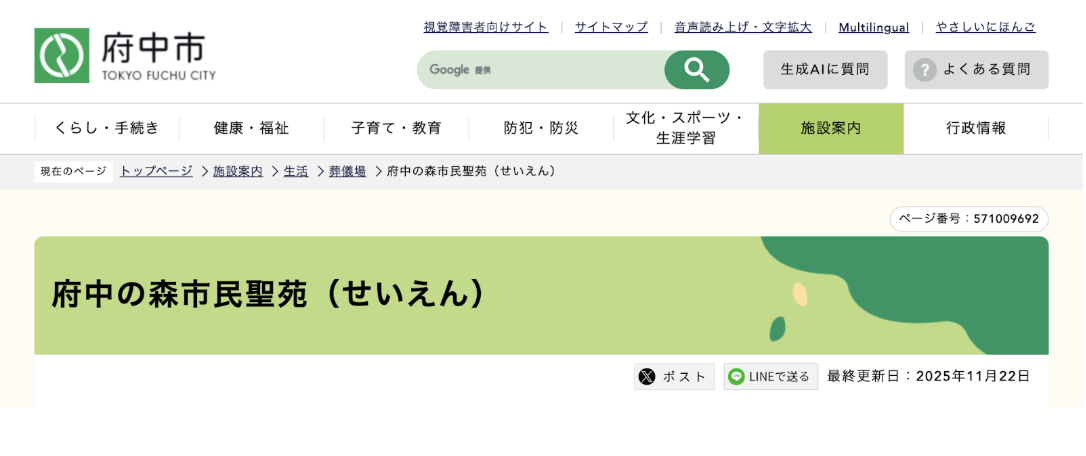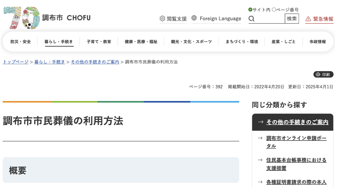 | アクセス | 申請窓口へは調布駅などからアクセス。 ※火葬場は市外(多磨葬祭場など)を利用 |