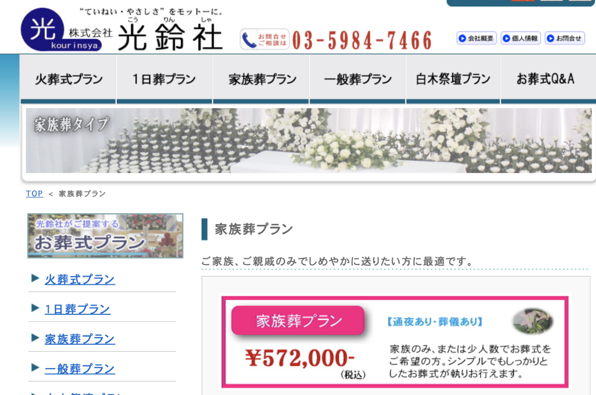 | 料金(初期費用/プラン等) | 火葬式(直葬) 約148,500円〜 一日葬 約429,000円〜 家族葬 約638,000円〜 一般葬・社葬 |